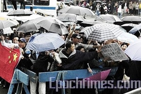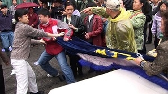 Molipsite de multime, cateva femei in varsta au inceput sa condamne practicantii Falun Gong. Cand au fost intrebate de ce sunt furioase, ele au raspuns: “Practicantii Falun Gong sunt aici sa impiedice oamenii sa doneze bani pentru victimele cutremurului din Sichuan.”