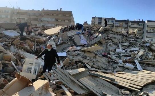 Imagini publicate de radioteleviziunea publică turcă arată ruinele unei clădiri dărâmate în centrul oraşului Izmir.
