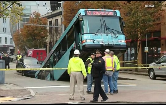 Autobuzul „Bridgeville Flyer” al Autorităţii Portuare a suferit un accident incredibil în Pittsburgh, Pennsylvania (Statele Unite). În timp ce vehiculul era oprit la intersecţia dintre Penn Avenue şi 10th Street, asfaltul a cedat şi s-a format o dolină.