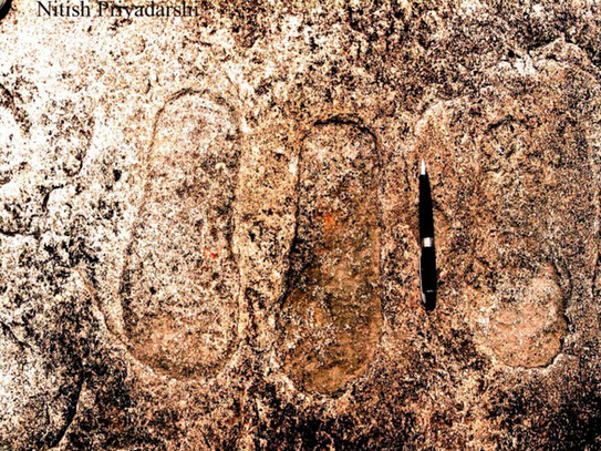 În localitatea Piska Nagri din statul Jharkahnd din India, geologul Nitish Priyadarshi studiază o pereche de urme mari de tălpi cioplite în piatră acum câteva mii de ani. Conform folclorului local ele semnifică aterizarea în acel loc a Zeilor din cer. Ceea ce i se pare şi mai interesant geologului e faptul că lângă urmele de tălpi este gravată imaginea unui obiect zburător.