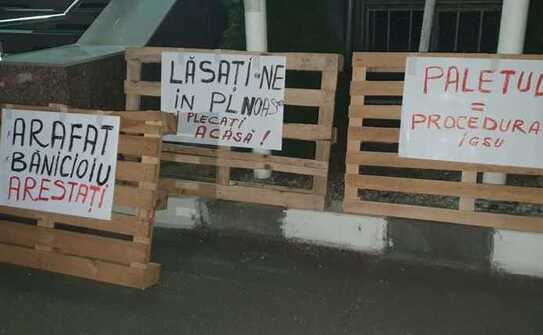 ISU, vizitat de protestatari. "Donaţie" în paleţi şi un mesaj pentru PNL: "Capul lui Arasin vrem"