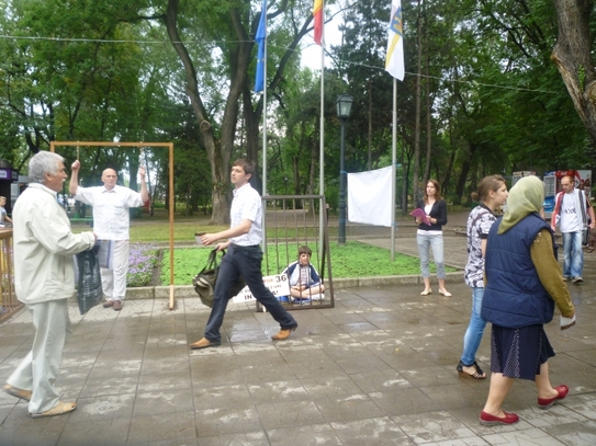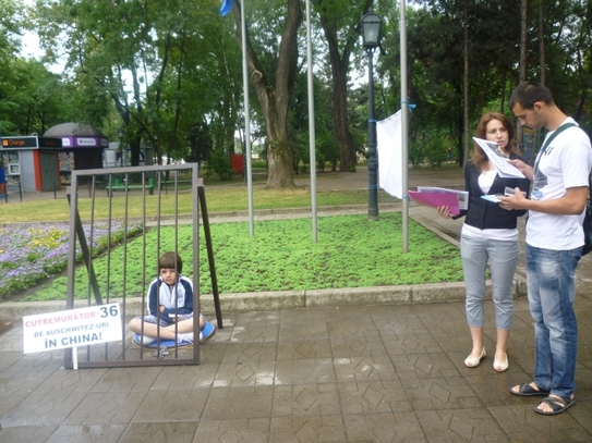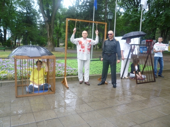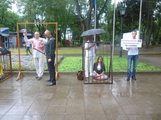 În semn de protest faţă de genocidul împotriva practicanţilor Falun Dafa, deşi la Chişinău a fost o zi rece cu ploaie, în Scuarul Europei au fost prezentate unele din cele 100 de metode de tortură aplicate până în prezent în China, celor care se călăuzesc după principiile Adevăr, Compasiune şi Toleranţă şi practică exerciţii pentru însănătoşirea corpului.