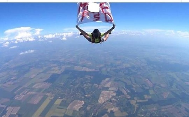 Un paraşutist român a sărit dintr-un elicopter, de la peste 4.000 de metri, cu un banner inscripţionat cu mesajul M..PSD, în semn de protest faţă de modul în care formaţiunea politică ştie să îşi respecte promisiunile.