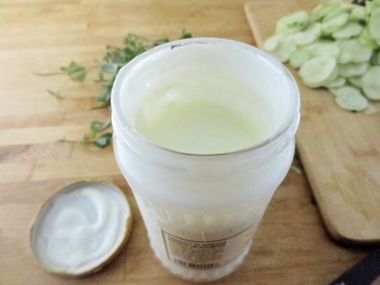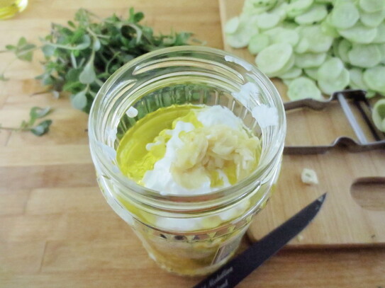 Într-un borcan cu capac se toarnă iaurtul, uleiul de măsline, pasta de usturoi şi sare. Se închide capacul, apoi borcanul se agită bine de tot, până ce toate ingredientele se amestecă şi se obţine un sos omogen.