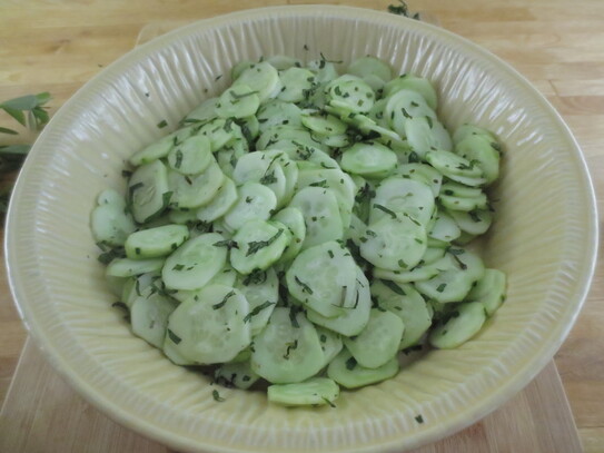 Castraveţii tăiaţi se pun într-un castron, iar pe deasupra se presară o parte din verdeaţa mărunţită ( mentă şi cimbru).