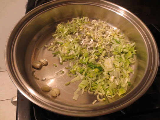 Uleiul se pune într-o cratiţă mare apoi se adaugă prazul/ceapa şi usturoiul; se gătesc până când acestea se înmoaie.