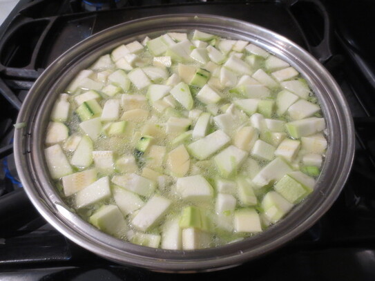 Se adaugă cartofii, dovleceii şi apă atât cât să le acopere. După ce au dat în primul clocot, se reduce focul, se acoperă cratiţa cu un capac şi se fierb aproximativ 20 minute, până când legumele devin moi.