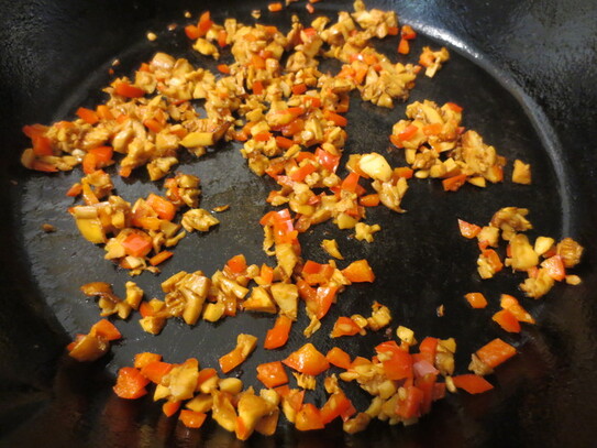 Între timp ciupercile se curăţă de impurităţi, se spală bine cu apă rece, apoi se mărunţesc. Feliile de ardei roşu se mărunţesc de asemenea. Într-o tigaie, se pun câteva picături de ulei, apoi se adaugă ciupercile şi ardeiul mărunţit. Se gătesc, până când apa lăsată de la ciuperci se evaporă. Se presară puţină sare, apoi se iau de pe foc şi se lasă deoparte.