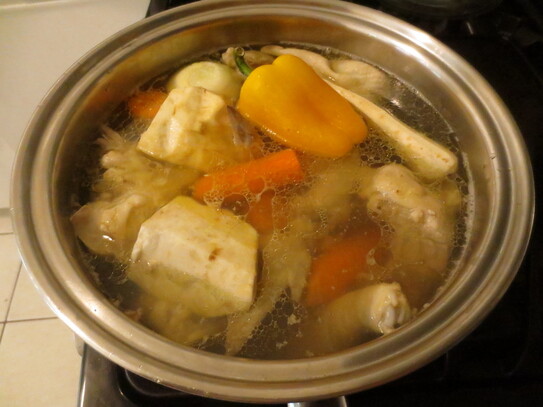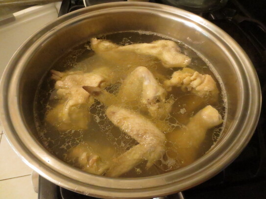 Se pun la foc 2-3 litri de apă cu sare, iar când apa începe să clocotească se adaugă pe rând bucăţile de pui. După ce dă din nou în clocot, se reduce focul la mediu mic.