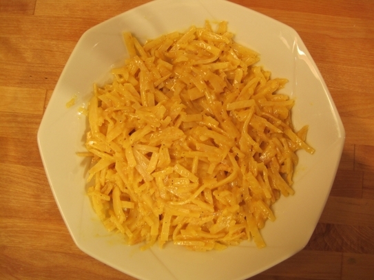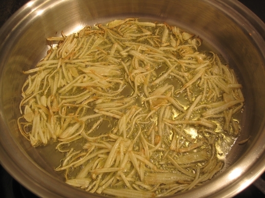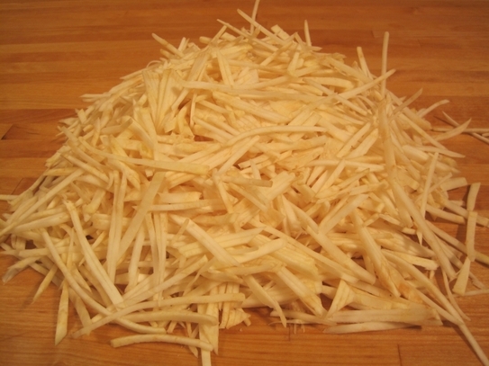 Se alege o ţelină tinără care să nu fie nici găunoasă, nici aţoasă. Ţelina se curăţă de coajă şi rădăcini şi se taie în felii subţirele precum chibriturile.