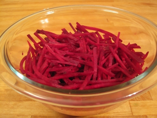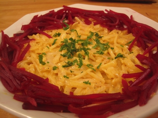 Opţional, se poate completa această salată cu sfeclă fiartă sau coaptă, pe care o tai întocmai ca ţelina.