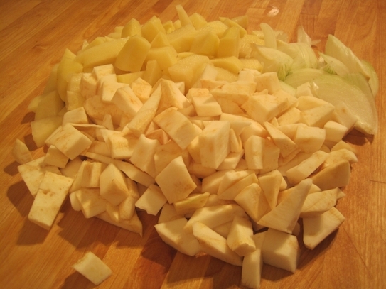 Se curăţă ţelina, se spală şi se taie în bucăţele. Se fierbe în apă sărată împreună cu un cartof făinos şi o ceapă tăiată felii. Se poate adăuga şi zeamă (vită, pasăre sau zarzavat) dacă ai la îndemână. Se acoperă şi se lasă să fiarbă la foc potrivit, circa o jumătate de oră. Se strecoară şi apoi se zdrobeşte, pană se obţine o pastă omogenă, pe care apoi se trece printr-o sită foarte fină. Se adăuga unt şi smântână (două -trei linguri). Se mai lasă la foc blajin să fiarbă cam cinci minute.