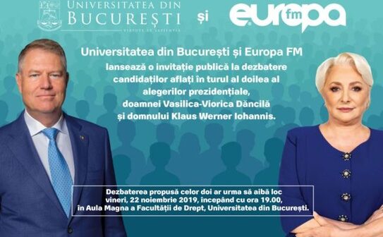 Universitatea din Bucureşti şi Europa FM lansează o invitaţie publică la dezbatere candidaţilor la alegerile prezidenţiale aflaţi în turul al doilea, doamnei Vasilica-Viorica Dăncilă şi domnului Klaus Werner Iohannis.