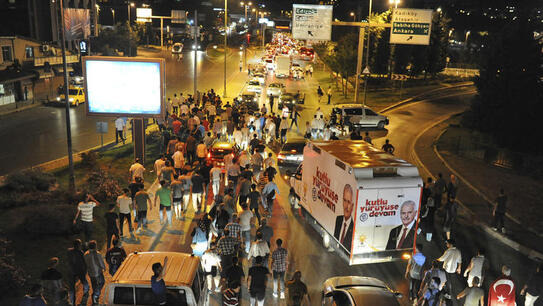 Erdogan, care se afla în vacanţă pe coastă când a fost lansată tentativa de lovitură de stat, a zburat în Istanbul cu câteva ore înaintea zorilor zilei de sâmbătă şi a apărut la televizor în mijlocul unei mulţimi de susţinători în faţa aeroportului oraşului, pe care conspiratorii au eşuat să îl securizeze. Erdogan a declarat că a avut loc o tentativă de bombardare a unui hotel din Marmaris, unde se afla în momentul începerii haosului, adăugând că plecase înainte de acea operaţiune.