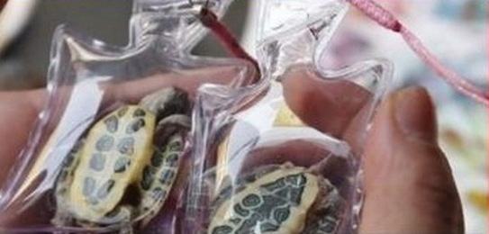5. Brelocuri cu animale vii pentru chei. Pui micuţi de broaşte ţestoase şi peştişori de aur sunt puşi într-un pachet închis etanş din plastic în care se află o soluţie nutritivă, şi fac din asta brelocuri pentru chei. Aceste animăluţe pot supravieţui într-un astfel de pachet doar trei luni. Aceste produse i-au şocat pe membrii organizaţiei pentru protecţia animalelor.