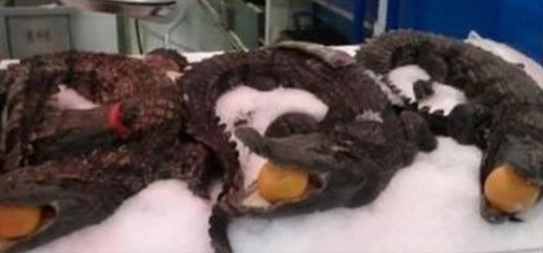 7. Crocodili şi rechini în supermarket. Lanţul chinez de supermarketuri Walmart, în departamentul de fructe de mare proaspete (delicatese marine) vând crocodili şi rechini întregi. Deoarece se crede că, dacă vei consuma carne de crocodil te va ajuta să-ţi vindeci astmul. De asemenea se crede că a consuma carne de rechin ajută la îmbunătăţirea funcţiei organelor interne.