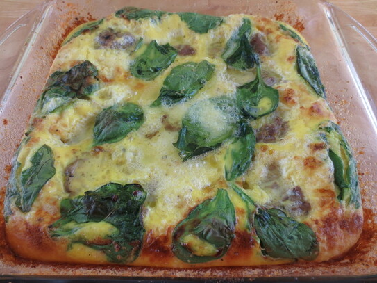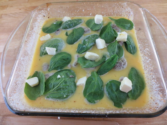 După ce amestecul e omogen, se toarnă peste bucăţile de creier. Peste ouă se adaugă frunzele de spanac şi cubuleţele de unt.