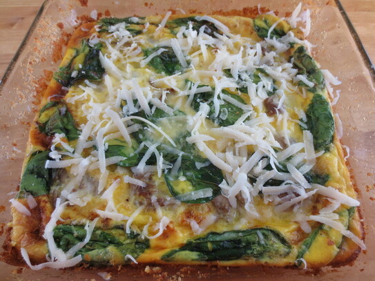 Se dă la cuptor 30 minute. După ce ouăle s-au copt, tava se scoate şi se lasă deoparte să se răcească cam 10 minute, lăsând timp untului topit de deasupra să pătrundă bine în compoziţie.