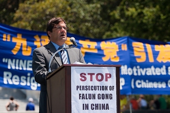 Vorbind sutelor de practicanti Falun Gong, care au stat pe cateva randuri in fata podiumului, tinand pancarde cu cei omorati si torturati la comanda PCC, Farr a afirmat "continuati cu protestele non-violente."