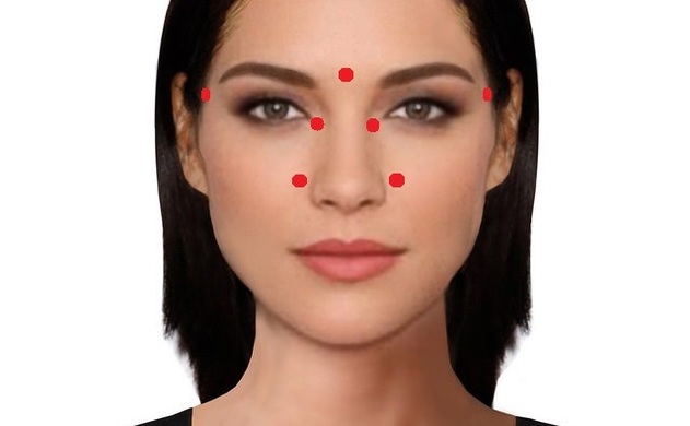 - punctele simetrice de pe tâmple, la o distanţă de aproximativ 2 cm de marginea exterioară a sprâncenelor.