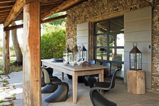 Cheia pentru amenajarea unui spaţiu rustic modern este o podea de culoare deschisă, mobilier modern, ferestre mari şi elemente arhitecturale naturale, conservate şi expuse. Schema de culori este foarte simplă, combinând culori neutre cu cele calde, de pământ.
