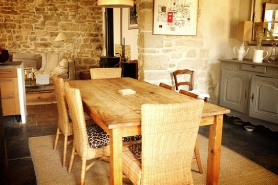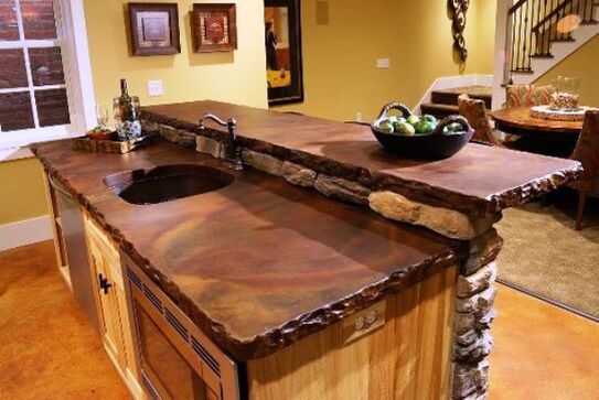 Amenajări interioare în stil rustic şi modern. Masa de bucătărie din cărămidă sau piatră de râu