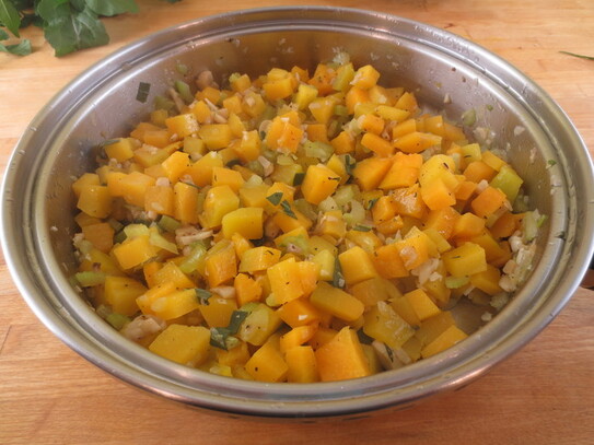 După câteva minute, se pun cubuleţele de dovleac, cimbru, salvia, sare şi piper după gust. Se amestecă bine, după care se acoperă cu un capac. După ce legumele au început să fiarbă, se reduce focul.