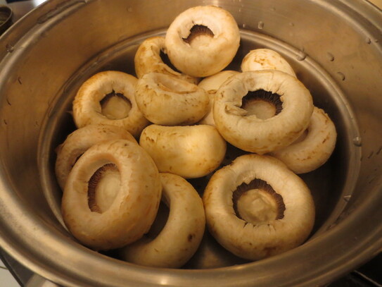 Mai întâi se curăţă ciupercile de codiţe şi se spală bine cu apă rece. Pentru a evita zbârcirea şi uscarea ciupercilor când acestea sunt puse la cuptor, ciupercile curăţate se fierb pe aburi cam 5 minute, apoi se lasă la scurs. Codiţele se mărunţesc pentru umplutură.