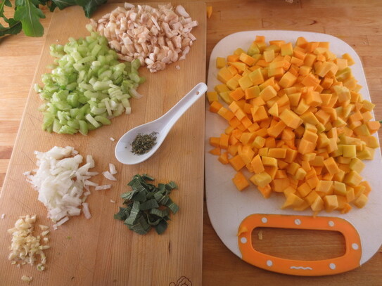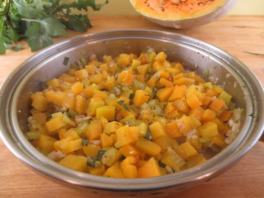 După ce legumele au început să fiarbă, se reduce focul. Se fierbe în continuare până când dovleacul este fiert (aprox 15 minutes). Tigaia se dă deoparte câteva minute să se răcească puţin.