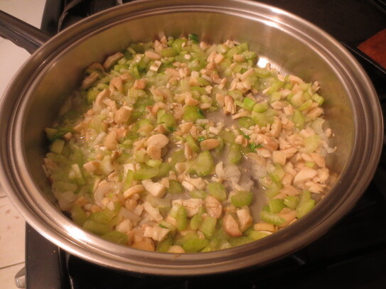 Într-o tigaie de mărime potrivită, se pune ulei, la temperatura mediu-mic. Se adaugă ceapa mărunţită, usturoiul zdrobit şi mărunţit, tulpinile de ţelină şi ciupercile mărunţite.