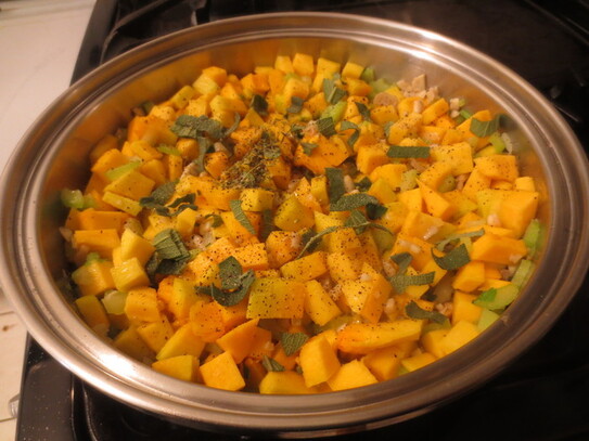 După câteva minute, se pun cubuleţele de dovleac, cimbru, salvia, sare şi piper după gust. Se amestecă bine, după care se acoperă cu un capac.