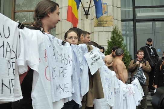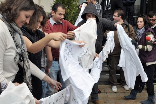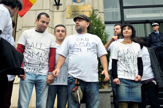 ”Statul care este angajatul societăţii ca să dezvolte România a blocat banii de rambursări, sub tot felul de tertipuri birocratice, pentru ca 3000 de companii şi ong-uri să aibă de suferit, pentru ca 100 000 de oameni să intre în şomaj, pentru ca oamenii care şi-au garantat la bancă pentru credite, bani pentru a satisface şi a continua proiectele, şi-au pierdut casele. Situaţia este foarte dramatică. De aceea am ajuns să protestăm simbolic cu aceste tricouri pe care le-am dat jos de pe noi, le-am băgat într-un sac, pe care îl ataşăm unui memorandum ministerului de finanţe”, a declarat Liviu Mihaiu.
