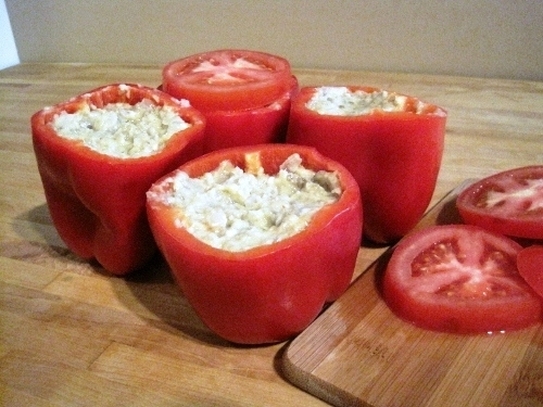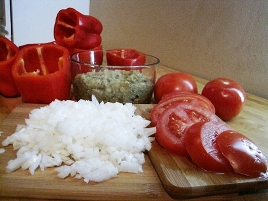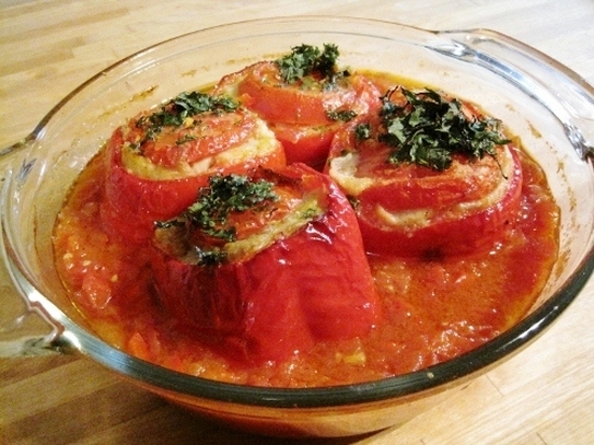 Se umplu ardeii cu amestecul obţinut, după care se acoperă fiecare ardei cu un capac făcut dintr-o felie de roşie. Pentru a le da un gust mai deosebit, ardeii se prăjesc uşor în ulei. Se aranjează apoi într-un vas care rezistă la temperaturi înalte.
