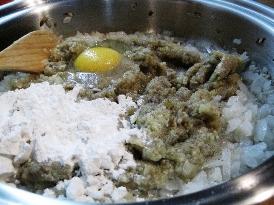 Se amestecă vinetele coapte, decojite şi tocate cu ceapă prăjită, ou, sare, piper şi făină.