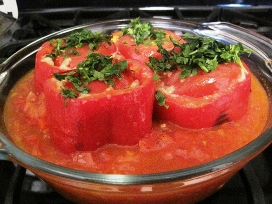 Se presară pătrunjel tocat şi mărar pe deasupra şi se dau la cuptor la foc mic. Se coc până când ardeii devin moi.