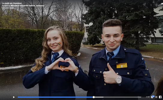 În clip apar tineri în uniforma Academiei de Poliţie, cu tricolorul desenat pe faţă şi zâmbind larg şi încrezător.