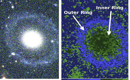 Un studiu publicat recent în revista Monthly Notices of the Royal Astronomical Society a făcut un pas înainte în efortul de a descoperi galaxii antice şi a înţelege modul în care funcţionează acestea. Autorii studiului afirmă că au observat un nou tip de galaxie. Spre deosebire de oricare altă galaxie observată până în prezent, se pare că aceasta este înconjurată de două inele circulare formate din gaz şi stele.