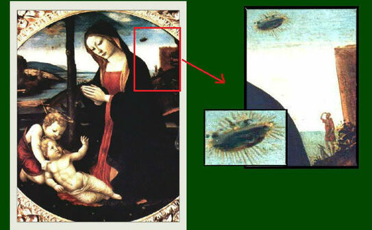 Unul dintre cele mai emblematice tablouri folosite ca exemplu este ”Madonna cu Sfântul Giovannino”, pictată de Domenico Ghirlandaio în secolul XV; opera este afişată în prezent în Muzeul de la Palazzo Vecchio din Florenţa, Italia. Pictura îi înfăţişează pe Sfânta Maria şi pe pruncul Iisus, dar în fundalul îndepărtat apare un bărbat care se uită la cerul întunecos alături de un câine. Ambii par să privească fix un obiect de pe cer, care arată remarcabil de asemănător cu descrierea modernă a unei farfurii zburătoare, care emană o energie radiantă, aurie.