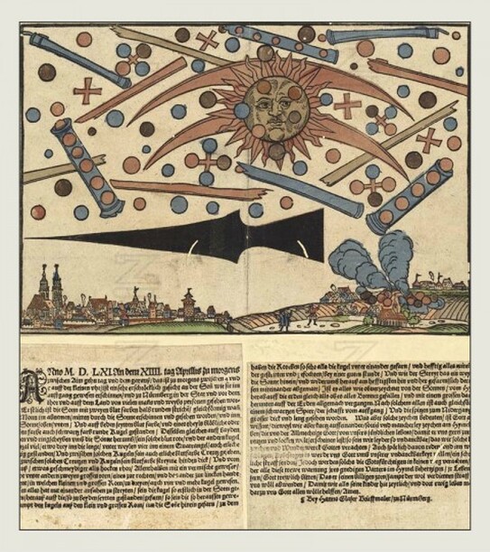 Câteva reprezentări de la sfârşitul Evului Mediu înfăţişează obiecte celeste stranii în picturi şi artă care nu au legătură cu religia. O gravură în lemn a artistului Hanns Glaser descrie evenimentele de pe 14 aprilie 1561, din Nuremberg, Germania. Gravura arată câteva obiecte zburătoare în mişcare care cad de pe cer lăsând în urmă fum, scenă observată de mulţi oameni. O monedă franceză produsă în jurul anului 1680 descrie de asemenea un obiect rotund pe cer care seamănă cu o farfurie zburătoare.