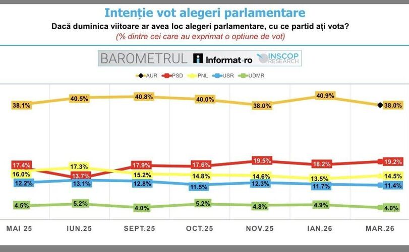 • AUR: 38% dintre alegători ar vota cu AUR (faţă de 40.9% în ianuarie 2026, 38% în noiembrie, 40% în octombrie, 40.8% în septembrie, 40.5% în iunie, 38.1% în mai 2025).
