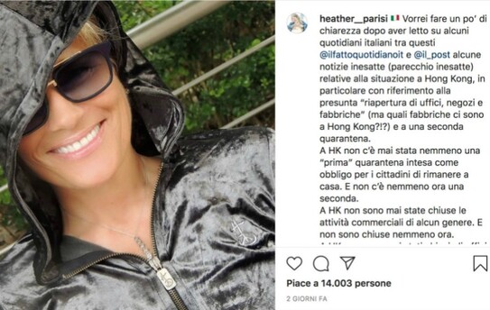 "Aş dori să clarific un pic după ce am citit în unele ziare italiene ştiri inexacte (destul de inexacte) despre situaţia din Hong Kong, în special cu referire la presupusa "redeschidere a birourilor, magazinelor şi fabricilor" (dar ce fabrici sunt în Hong Kong?!?) şi la o a doua carantină". Astfel începe lunga postare publicată pe Instagram în care Heather Parisi, o balerină foarte cunoscută şi faimoasă în Italia, explică cum stau lucrurile în Hong Kong, unde locuieşte. În ultimele ore, de fapt, au început să circule în Italia ştiri despre un nou vârf al infecţiilor după relaxarea măsurilor restrictive şi o presupusă nouă închidere a activităţilor.