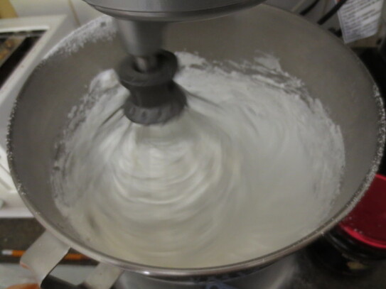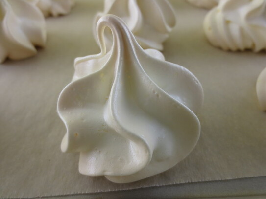 Se adaugă un praf de sare şi un praf de cremă de tartar şi se continuă baterea până când spuma se întăreşte. Se adaugă pe rând zahărul tos şi vanilia "în ploaie", continuând baterea spumei până când zahărul se dizolvă. Spuma devine tare astfel încât telul stă în picioare, iar compoziţia nu curge.