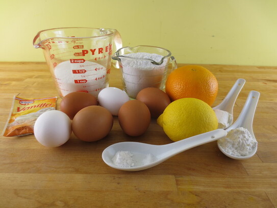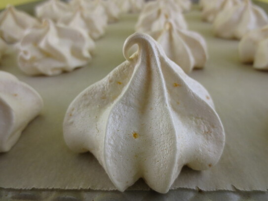 Se cerne zahărul pudră amestecat cu amidon, iar prin răsturnare, se amestecă uşor, până când se încorporează. Compoziţia se împarte în trei. Într-una din porţii se amestecă uşor coaja de portocală; în alta se adaugă coaja de lămâie. Din fiecare compoziţie porţionată iese o tavă de bezele.