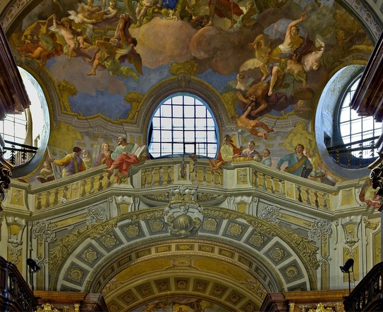 Decorarea sa se evidenţiază prin stilul baroc, în special tavanul, care reprezintă artele şi ştiinţele.