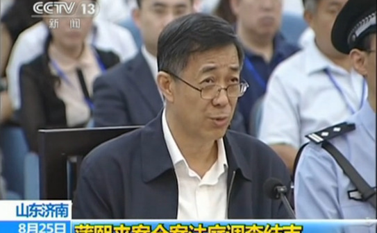 Procesul de sâmbătă 24 august, a durat o zi întreagă şi a adus acuzaţii conform cărora Bo a delapidat fonduri publice în valoare de 5 de milioane de yuani (816.860 de dolari). Procurorii au derulat un film cu fosta soţie a acestuia, Gu Kailai (care este condamnată pentru moartea omului de afaceri britanic Neil Heywood) care arată cum Bo oferă permisiunea unui oficial să depoziteze în contul Gu Kailai banii delapidaţi din urma unui proiect de lucrări publice.