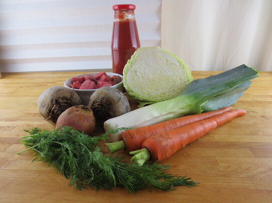 Când prazul şi morcovii încep să se înmoaie, se adaugă sucul de sfeclă, roşiile tăiate în cubuleţe, varza tocată, apă, 2 linguri de pastă de tomate şi câteva linguri de mărar tocat.