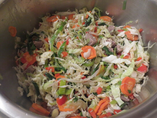 În oala în care se face supa, se încălzesc la foc mediu 2 linguri de ulei. Se adaugă prazul, se căleşte cam un minut, apoi se adaugă carnea de vită. Se călesc în continuare câteva minute, după care se adaugă morcovii, amestecând din când în când.