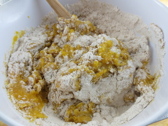 Într-un castron separat, amestecă împreună cele două căni de dovleac fiert, cu uleiul vegetal şi ouăle.