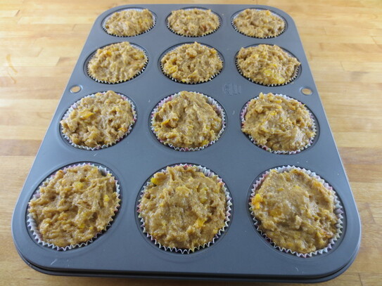 Se adaugă pasta de dovleac în amestecul de faină şi se amestecă uşor până se omogenizează. Se pune aluat în fiecare formă de brioşă.