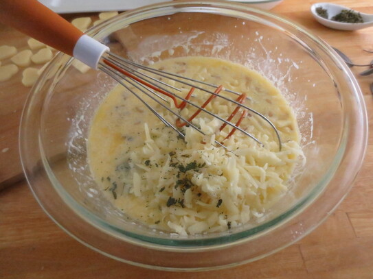 În alt castron, se amestecă împreună laptele bătut şi untul topit, apoi se bat pe rând ouăle, iar la sfârşit se adaugă caşcavalul ras, lăsând deoparte cam două linguri pentru ornat.